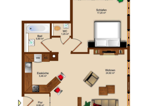 Die Wohnung überzeugt durch ihre durchdachte Raumaufteilung und die hochwertige Ausstattung. Das Wohnzimmer und das Schlafzimmer bieten ausreichend Platz für gemütliches Wohnen und Entspannen. Die Küche ist funktional gestaltet und lässt Raum für individuelle Gestaltungsideen. Die Wohnung verfügt außerdem über ein kleines Bad mit Wanne sowie einem Gäste-WC.