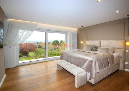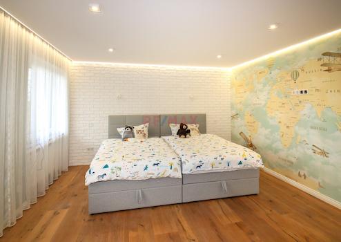 OBERGESCHOSS: Hier befinden sich die Schlafzimmer, an der Zahl 5 Stück. Sie finden hier für jeden die richtige Größe. Im großen Elternschlafzimmer haben Sie Zugang zu einem begehbaren Kleiderschrank und einem Balkon, von dem aus Sie den unverbauten Weitblick über den Taunus genießen können.