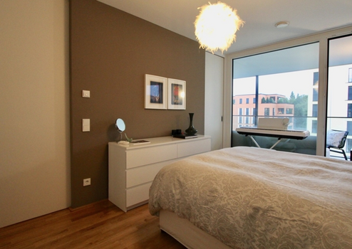 Das Schlafzimmer ist durch zwei raumhohe Schiebetüren vom Rest der Wohnung getrennt. Die Türen verschwinden in geöffnetem Zustand unsichtbar in der Wand und nehmen keinerlei Platz weg. Im Schlafzimmer wurde ein deckenhoher Einbauschrank über die gesamte Raumbreite eingebaut. Auch hier haben Sie ausreichend Platz für alles und zudem einen wunderbaren Blick in die Parklandschaft - direkt vom Bett aus.