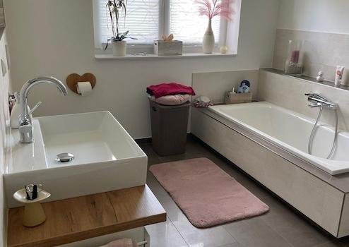 Das große Bad im Obergeschoß samt Badewanne und einer zusätzlichen Dusche lädt zum Entspannen und Wohlfühlen ein.
