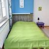 Schlaf/Arbeitszimmer mit Bett 140x200 cm, Kleiderschrank, Schreibtisch mit Stuhl.