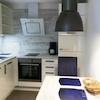 Offene Einbauküche, komplett ausgestattet mit Esstisch, Stühle, Mikrowelle, Ofen, Dunstabzug, Geschirrspüler, Kühl-Gefrierkombination.
