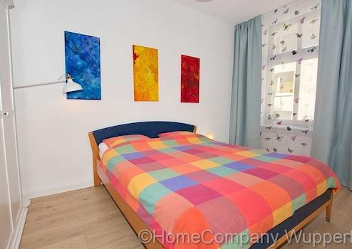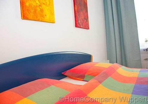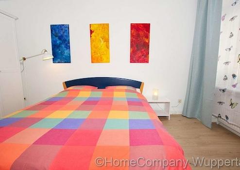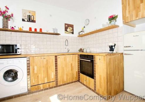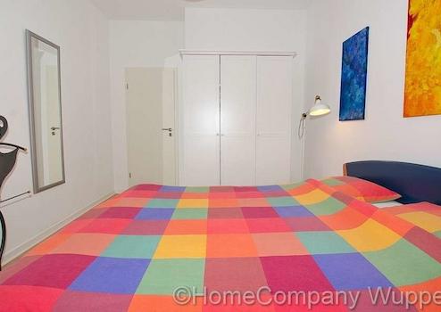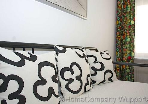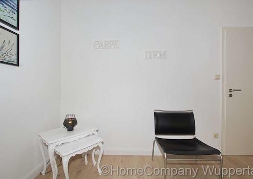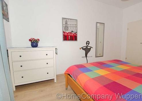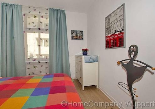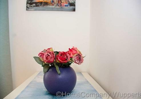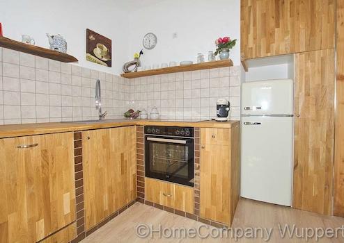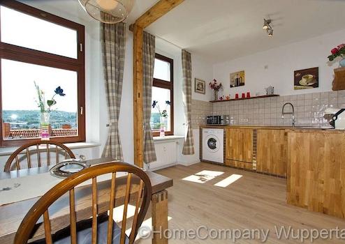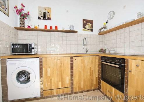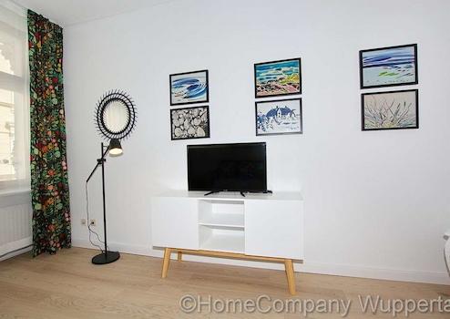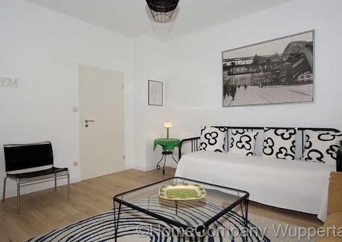 In der 1. Etage eines typischen bergischen Altbaus befindet sich diese schicke 2-Zimmerwohnung. Die gesamte Wohnung ist mit einem Laminatboden in Holzoptik ausgelegt. Das Wohnzimmer verfügt über einen Wohnbereich mit einer bequemen Couch, einen Lehnstuhl, großem Couchtisch und mehreren Beistelltischen und einem Sideboard mit TV-Flachbildschirm, außerdem steht hier Bett mit Außklappfunktion (1,60mx2,00m). Das Schlafzimmer bietet ein Bett in Komfortgröße (1,60x2,00m), eine Kommode und einen großen Kleiderschrank. Die moderne Einbauküche lässt keine Wünsche offen: Ceranfeld mit Backofen und Dunstesse, eine Spülmaschine, eine Kühlgefrierkombination und alle Kochutensilien und Geschirr werden hier zur Verfügung gestellt. Zudem ist hier ein großzügiger Essbereich mit Vitrine und dem einladenden Esstisch für 4 Personen mit Blick über die Dächer von Wuppertal. Das Badezimmer wurde mit einer Badewanne und Duschvorhang, einem WC und einem Spiegel mit Ablage ausgestattet. Bettwäsche und Handtücher werden gestellt, eine Waschmaschine und Wäschetrockner zur Mitbenutzung sind im Treppenhaus untergebracht. Der Mietpreis beträgt € 1000,00 für eine Person inklusive aller Energie- und Nebenkosten, der Mitbenutzung des Internet- Zugangs und der Treppenhausreinigung. Der Mietpreis für 2 Personen liegt bei € 1150,00 und für 3 Personen bei 1300. Die Endreinigung zahlt der Mieter. Sie erfolgt nach Aufwand und wird mit derzeit € 35,00 pro Stunde abgerechnet.