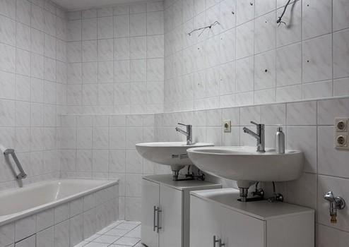 Fliesen ausgestattet. In den Schlafräumen sowie im Wohnzimmer sorgt Laminat für ein an-