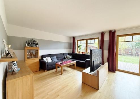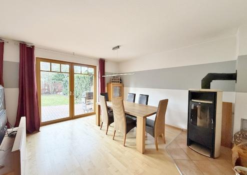 Das großzügige Wohn- und Esszimmer erstreckt sich über die gesamte Hausbreite. Bodentiefe Fenster sorgen für eine freundliche, lichtdurchflutete Atmosphäre und geben den Blick auf Terrasse und Garten frei. Eine gemütliche Sofalandschaft sowie ein großer Esstisch finden hier problemlos ihren Platz. Der Kaminofen schafft an kühlen Tagen zusätzliche Behaglichkeit. Von diesem Bereich aus erreichen Sie die offene, einladende Terrasse im sichtgeschützten Garten.