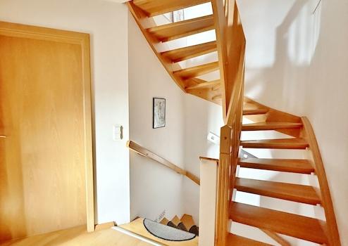 Über eine massive Treppe mit Buchenstufen gelangen Sie ins Obergeschoss.