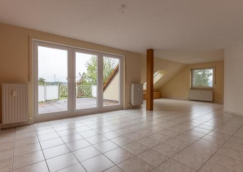 Zurück im unteren Bereich der Wohnung erreichen Sie rechts neben der Treppe das Gäste-WC. Entlang der Diele gelangen Sie auf der linken Seite in den großzügigen Wohn- und Essbereich. Hier finden sowohl eine große Wohnlandschaft als auch ein Esstisch bequem Platz. Von diesem Raum aus haben Sie direkten Zugang zur sonnigen Dachloggia mit Westausrichtung perfekt, um die Abendsonne in ruhiger Atmosphäre zu genießen.