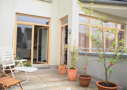 Erdgeschoss: drei Zimmer, Küche, zwei Bäder und eigene Terrasse