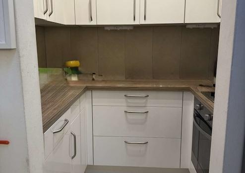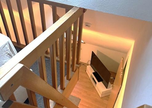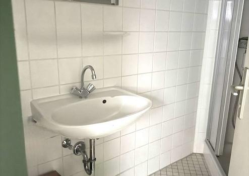 Die Maisonette Wohnung ist mit einer neuwertigen Einbauküche mit zwei Herdplatten und einem Kühlschrank ausgestattet. Die Bäder und das Gäste-WC verfügen über WC, Dusche und Waschbecken.