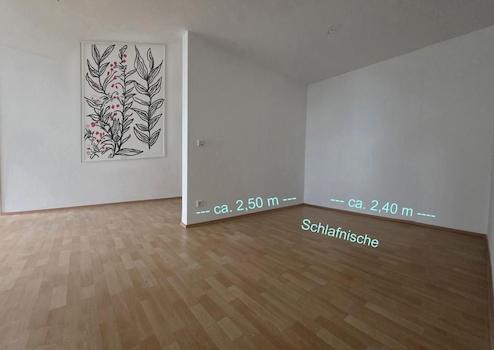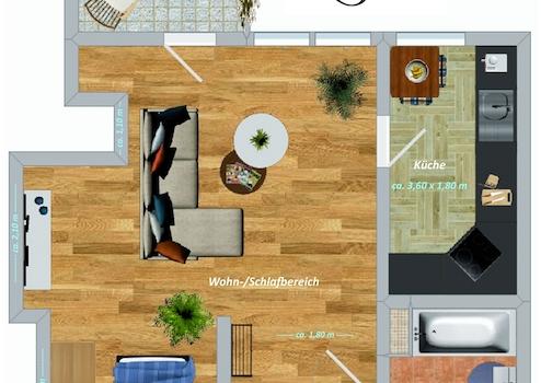 • Das charmant geschnittene Wohnzimmer ist mit der Küche verbunden und führt direkt auf den sonnigen Balkon. Es bietet eine durchdachte Lösung für den Schlafbereich: Eine praktische Nische in der hinteren Ecke ist ideal dimensioniert für die Platzierung eines Bettes und eines Schranks. So wird der komplette Hauptraum optimal zum Wohnen genutzt.