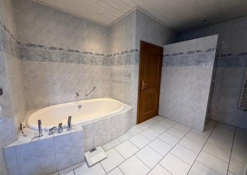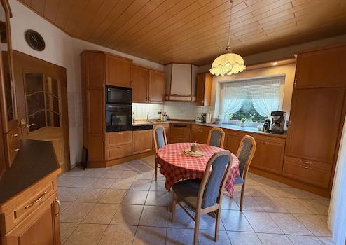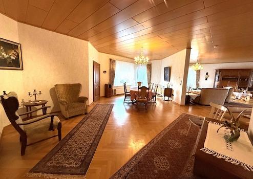 Schon beim Betreten der geräumigen Diele durch die rustikale Holzeingangstür wird klar, dass hier ganz besondere und großzügige Räumlichkeiten (Deckenhöhe 2,75 m) auf Sie warten. Alle Zimmer sind lichtdurchflutet und vermitteln dadurch ein ausgesprochen freundliches Ambiente. Ob Büro/Gästezimmer, Schlafzimmer, Esszimmer oder Gäste WC, es ist deutlich zu merken, dass hier vom Fußboden bis zur Zimmerdecke mit Augenmaß ausgestattet und eingerichtet wurde. Im großzügigen und offen gestalteten Esszimmer und Wohnzimmer, welches übrigens über einen Kamin/Kachelofen und einen Ausgang auf die teilüberdachte Terrasse mit Süd-West-Ausrichtung verfügt, ist Echtholzparkett verlegt, im Schlafzimmer beispielsweise Teppich und die Badezimmer, eines mit Dusche und Badewanne, sowie die Küche mit Einbauküche und der große Abstellraum sind sinnvollerweise gefliest. Eine Etage mit Fußbodenheizung und elektrischen Rollläden, die wenig Wohnwünsche offenlässt. Es ist zu ergänzen, dass auch Esszimmer und Küche einen Ausgang zur Terrasse haben.