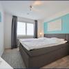 Das Schlafzimmer ist kompakt, aber effizient geschnitten und bietet Platz für ein Doppelbett sowie Stauraum. Das modernisierte Badezimmer verfügt über eine Dusche, WC und Waschbecken.