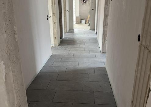 •Vinylfußboden in allen Wohnbereichen und Küche, im Flur und Bad Bodenfliesen