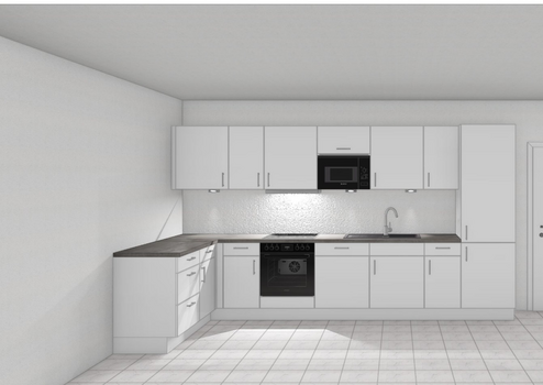 Geschirrspüler, 4 Plattenkochfeld, Mikrowelle, Backofen, Kühlschrank.
