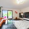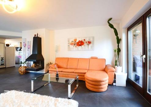 Der schöne Kamin ist ein echtes Highlight, das für Gemütlichkeit und - ergänzend zur Fußbodenheizung - behagliche Wärme sorgt. Die bodentiefen Fenster bringen zudem viel Licht in die Wohnung und die hochwertigen Fliesen vermitteln einen exklusiven Flair.