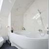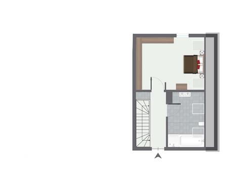 Über die Treppe aus massivem Holz erreichen Sie die obere Wohnebene. Hier finden Sie ein großzügiges Bad mit Badewanne und Dusche, sowie das komfortable Schlafzimmer vor. Ein praktischer Abstellraum, sowie ein separater Wohnungseingang runden diese Etage ab.