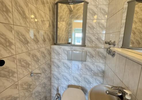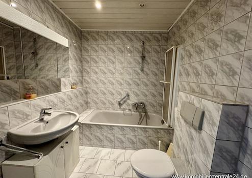 Das Badezimmer ist mit einer praktischen Duschbadewanne ausgestattet, ergänzt durch ein separates Gäste-WC.