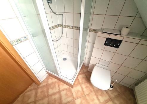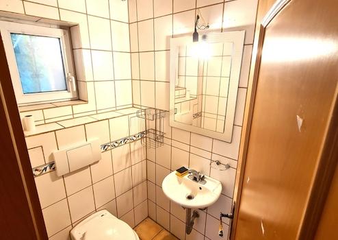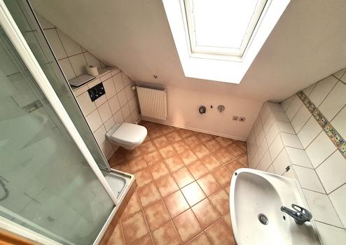 # Tageslicht-Badezimmer mit Dusche, WC, Handwaschbecken und Heizung im OG