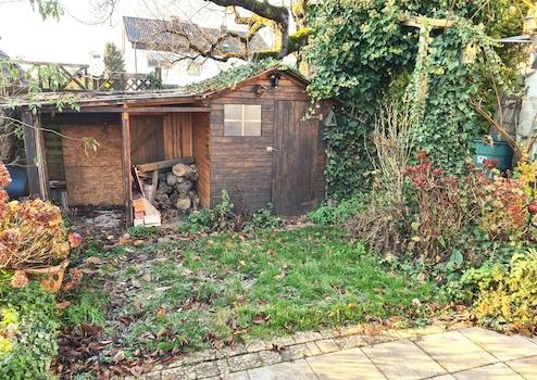 Im Außenbereich haben wir die angesprochene, große Terrasse, eine kleine Gartenhütte für z.B. Gartengeräte sowie den Garten vor dem Haus mit einem Pavillon.