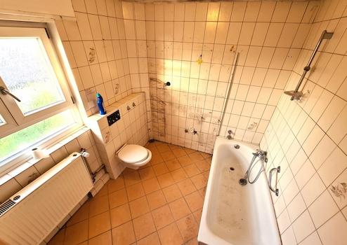 # Tageslicht-Badezimmer mit Badewanne, WC, Handwaschbecken und Heizung im OG