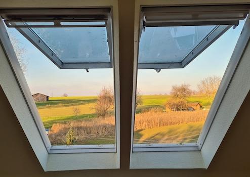 Im obersten Geschoss gibt es 2 weitere Schlafzimmer, eines mit Küchenanschlüssen und einem wunderschönen Fernblick über die Felder sowie ein Duschbad mit WC.