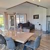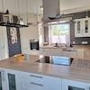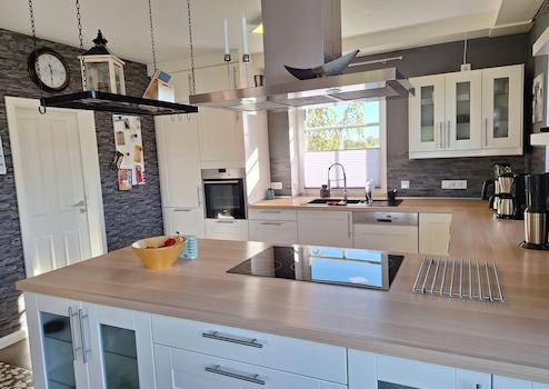 Im Erdgeschoss befindet sich der helle und offene Wohn-, Ess- und Küchenbereich mit einer Galerie und einem Kaminofen aus Speckstein.