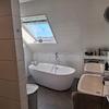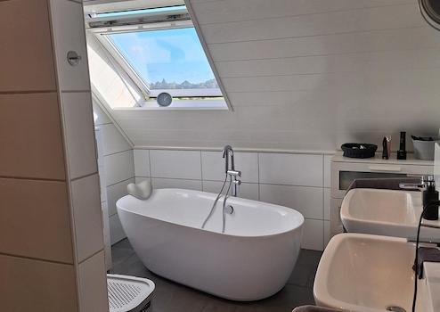 Im Obergeschoss befinden sich ein großzügiges Kinderzimmer, ein Bad mit barrierefreier Dusche und einer freistehenden Badewanne, einem großen Schlafzimmer und einem angrenzenden Ankleideraum.