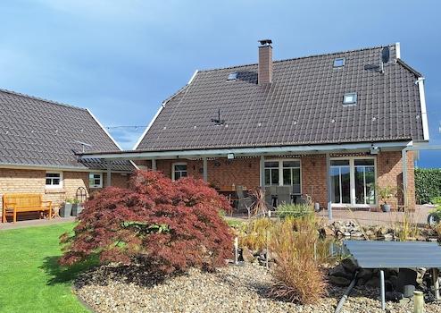 Unverbaute rückwärtige Ansicht, mit Blick auf Wiesen, Wallhecken und Bäumen