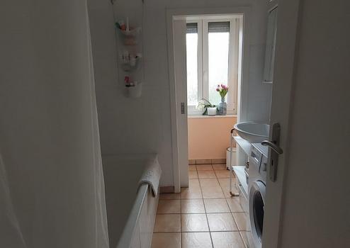 Das Badezimmer ist mit einer Badewanne ausgestattet und verfügt über ein Fenster, das für eine gute Belüftung und viel Tageslicht sorgt. Die Toilette ist abgetrennt vom Badezimmer.