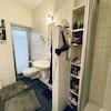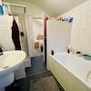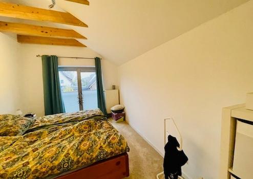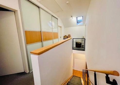 Eine moderne Holztreppe führt in das Obergeschoss. In dieser Etage befinden sich ein schönes Schlafzimmer und zwei gut geschnittene weitere Zimmer und ein schönes Tageslichtbad mit Dusche, Badewanne, Waschtisch und WC, ebenfalls mit dunklen Bodenfliesen ausgestattet.
