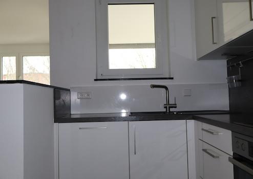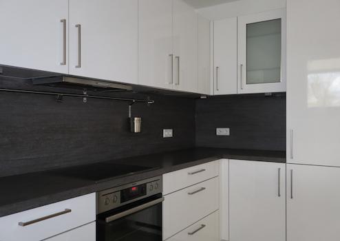 Einbauküche mit Induktionskochfeld, Backofen, Dunstabzug mit Außenabzug, Kühl-/Gefrierkombination, Geschirrspüler und Deckenlichtschiene.