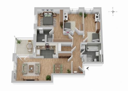 Der lichtdurchflutete Wohn- und Essbereich bildet das Herzstück der Wohnung. Das Schlafzimmer die beiden weiteren Zimmer sind ideal für Gäste, Homeoffice oder Hobbyräume. Die Küche ist praktisch an das Wohnzimmer angeschlossen.