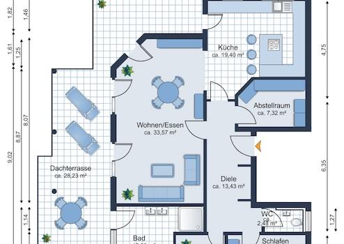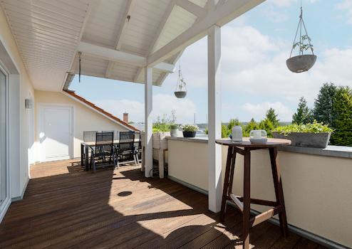 Die große Dachterrasse ist der Herzschlag dieser Wohnung. Hier beginnen Tage im Sonnenlicht und enden in warmen Sommerabenden mit Blick in den Himmel. Vielleicht entsteht hier Ihr kleiner Garten über den Dächern – oder ein privater Wellnessbereich, denn im angrenzenden Raum lässt sich problemlos eine Sauna realisieren.