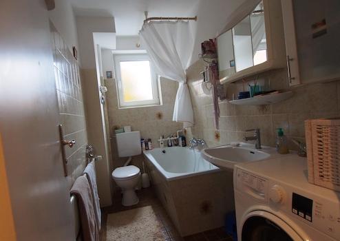 Bad mit Toilette, Waschbecken, Badewanne wird im Januar bis Türstockhöhe neu gefliest und hat ein Fenster. Hier ist auch der Anschluss für die Waschmaschine.