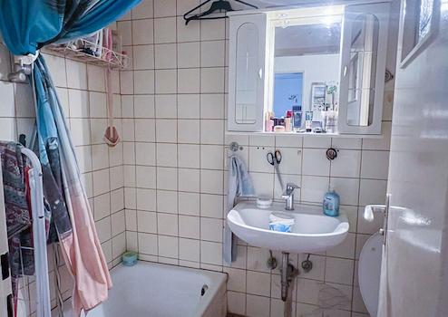 Das Badezimmer ist praktisch angelegt und bietet alle notwendigen Annehmlichkeiten. Ein zusätzlicher Pluspunkt ist der vorhandene Keller, der zusätzlichen Stauraum bietet.