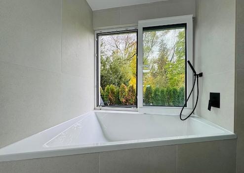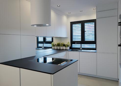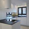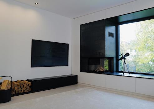 Eine Designküche mit Miele-Geräten, maßgefertigte Einbauten, ein Kamin mit Sitzbank sowie stilvolle Bäder mit edlen schwarzen Armaturen unterstreichen den hohen Qualitätsanspruch.