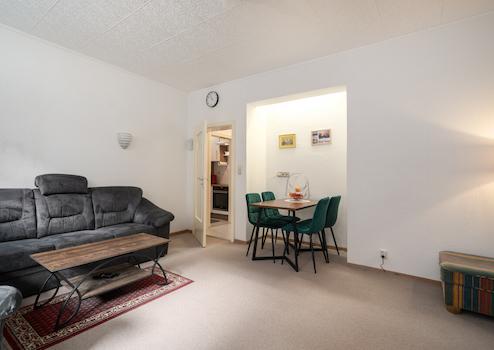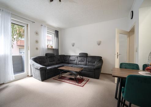 Der Wohnbereich bildet den Mittelpunkt des Zuhauses – durch die angenehme Deckenhöhe und die großen Fenster entsteht ein offenes, helles Raumgefühl. Von hier aus besteht Zugang zu einem der beiden Balkone, die dem Raum zusätzliches Tageslicht verleihen.