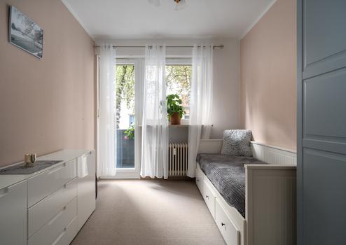 Das Schlafzimmer liegt direkt neben dem Wohnbereich und verfügt ebenfalls über einen eigenen Balkonzugang. So genießen beide Räume eine gleichmäßig helle Atmosphäre.