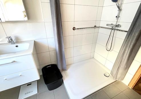 Das Badezimmer im Erdgeschoss wurde erst im Jahr 2018 modernisiert und wartet jetzt mit einem barrierearmen Duschbereich (mit Vorhang), einem ansprechenden Waschtisch mit Unterschrank + Spiegelschrank sowie einer erhöhten Toilette mit Haltegriff/Aufstehhilfe auf. Die 3 Schlafzimmer auf dieser Etage sind, zweckmäßigweise, alle in der Nähe des Badezimmers angeordnet.