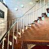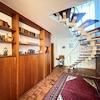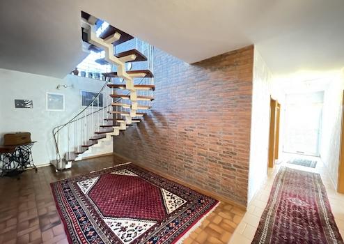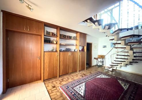 Nun aber zurück in den Eingangsbereich des Erdgeschosses und dort, über die bereits erwähnte, schön geschwungene, offene Holztreppe ins Untergeschoss des Hauses. Auch hier fällt der Blick direkt in die imposante Diele, von der aus alle Räume erreichbar sind. Die Ausstattung dieses Bereiches mit einer großen Bücherregal-Schrankwand bietet nicht nur Stauraum - alles wirkt dadurch sehr wohnlich und gemütlich.