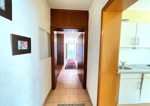 Entlang des üppig bepflanzten und liebevoll angelegten Vorgartens, erreicht man, über eine mit Verbundsteinen gepflasterte Fläche, die seitliche Treppe zu den beiden Hauseingängen im Untergeschoss und im Erdgeschoss (auf der Rückseite des Hauses). Schon beim Betreten des Erdgeschosses ist man erstaunt über die äußerst großzügige Diele, von der aus alle Zimmer dieser Etage erreichbar sind. Ein repräsentatives Entrée zum Empfangen von Gästen und viel Platz zur Unterbringung von Garderobe, Schuhe & Co. Hier lassen sich individuelle Wohnideen der zukünftigen Eigentümer verwirklichen, ohne dass der Raum beengt wirkt. Die vorhandenen Holz-Einbauschränke bieten jede Menge Stauraum und nehmen keinen Platz weg. Ein wirklich herrschaftlicher Dielenbereich von knapp 20 m², der, aufgrund des guten Lichteinfalls, hell, freundlich und einladend wirkt. Optimiert wird der Eindruck noch durch den Blick auf die offene Holztreppe mit schönem, weiß lackierten Geländer, die ins Untergeschoss führt, und auf die kontrastreiche Wandbekleidung mit Steinklinker.