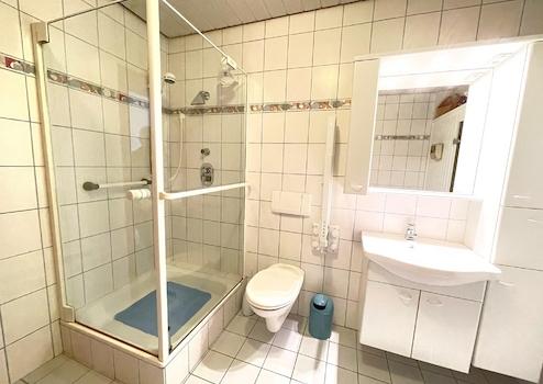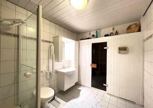 Das Badezimmer im Untergeschoss wurde ca. in den 90-er Jahren erneuert und wartet auch noch mit hübschen Badmöbeln und einer Sauna auf.