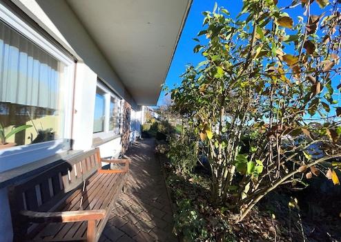 Dem Untergeschoss ist, zur Straßenseite hin, noch eine Terrasse vorgelagert, auf der man, wie auf dem Balkon darüber, in sonniger Südlage den Sommer in vollen Zügen genießen kann … und das mit Blick auf den schön bepflanzten Vorgarten.