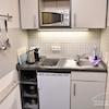 Wohn/Schlafzimmer mit Bett 90x200 cm, Kleiderschrank, Tisch, Fliesenboden, TV.