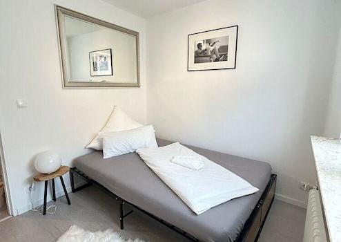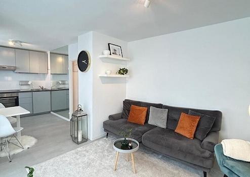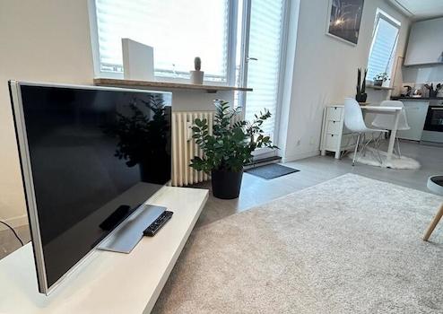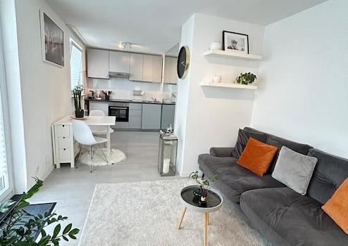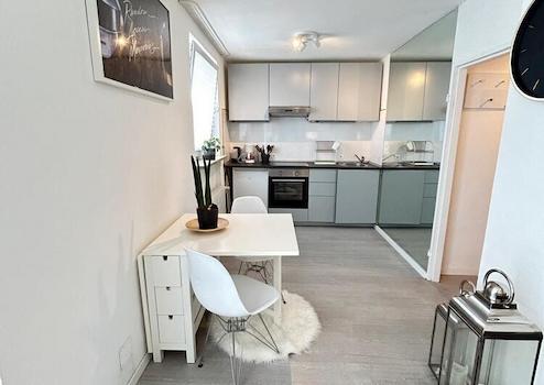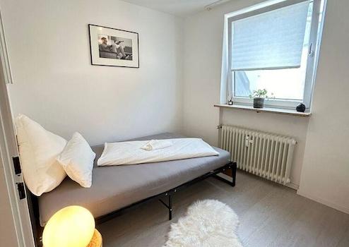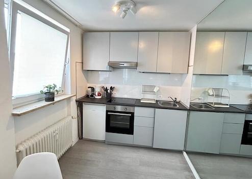 Die Wohnung bietet ein gemütliches Wohnzimmer mit Spiegelwand, Sofa, Arbeitsplatz und TV. Offene Küche mit Spülmaschine und verschiedenen Küchenutensilien. Schlafzimmer mit Boxspringbett 140x200 und Schrankwand. Neues, modernes Bad mit badewanne.