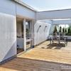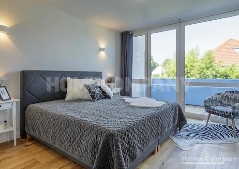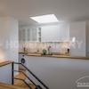 1. OG mit Aufzug Im unteren Bereich befindet sich das helle Schlafzimmer mit Balkon und großem Kleiderschrank. Das Schlafzimmer liegt ruhig nach hinten mit Blick ins Grüne. Hier befindet sich auch das Badezimmer mit Wanne. Über die hochwertige Holztreppe gelangt man in den oberen Wohnbereich. Hier liegt rechts die hochwertige Einbauküche mit allem für den täglichen Gebrauch. Der sonnendurchflutete Wohnraum lässt keine Wünsche offen. Von hier hat man Zugang zu der großen Dachterrasse mit 45m².
