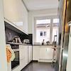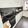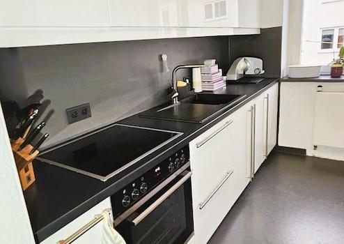 Küche (Nordost): Voll ausgestattete Einbauküche mit hochwertigen Markengeräten inklusive Geschirrspüler; Boden aus ökologischem Linoleum - pflegeleicht und angenehm fußwarm.