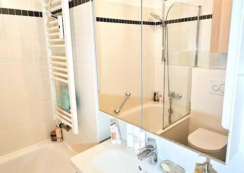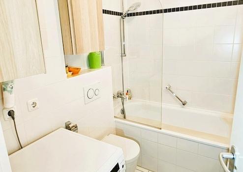 Innenliegendes Bad: Badewanne, WC, Waschbecken, Handtuchheizkörper sowie Platz für eine Waschmaschine.