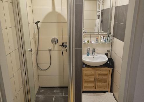 Das Bad ist mit einer Dusche ausgestattet und bietet genügend Platz für alltägliche Bedürfnisse.