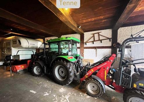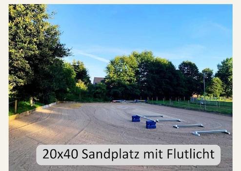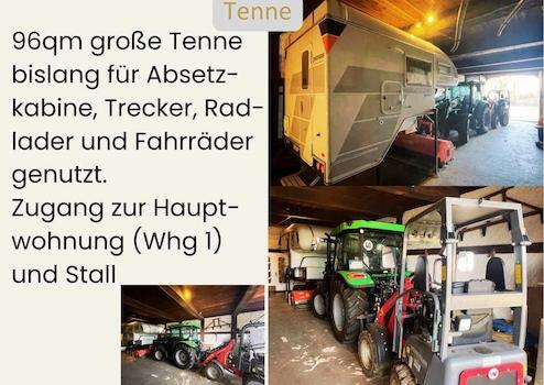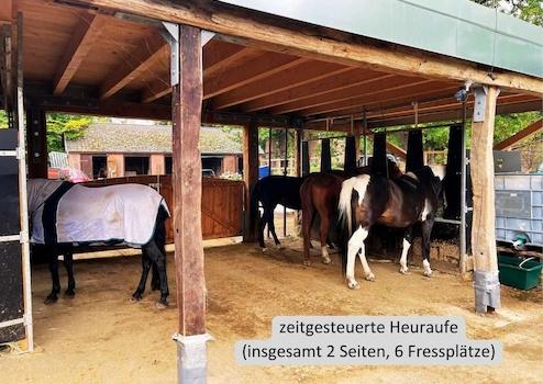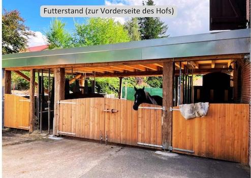 Für Pferdehaltung stehen Offen- und Aktivstall, acht Boxen, Sandplatz (20×40 m, Flutlicht), ca. 1,8 ha Koppeln, Futterstand und Rundlauf zur Verfügung. Hühnerstall, Werkstatt, Geräte- und Maschinenschuppen, drei überdachte Stellplätze, großer Teich, Hochbeete, Obst-, Kräuter- und Gemüsegarten runden das Angebot ab.